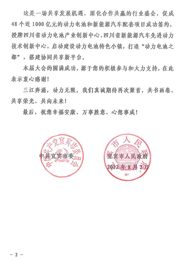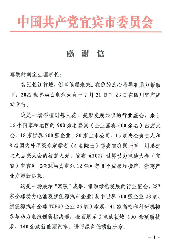 感謝信︱來自世界動力電池大會組委會和中共宜賓市委、宜賓人民政府