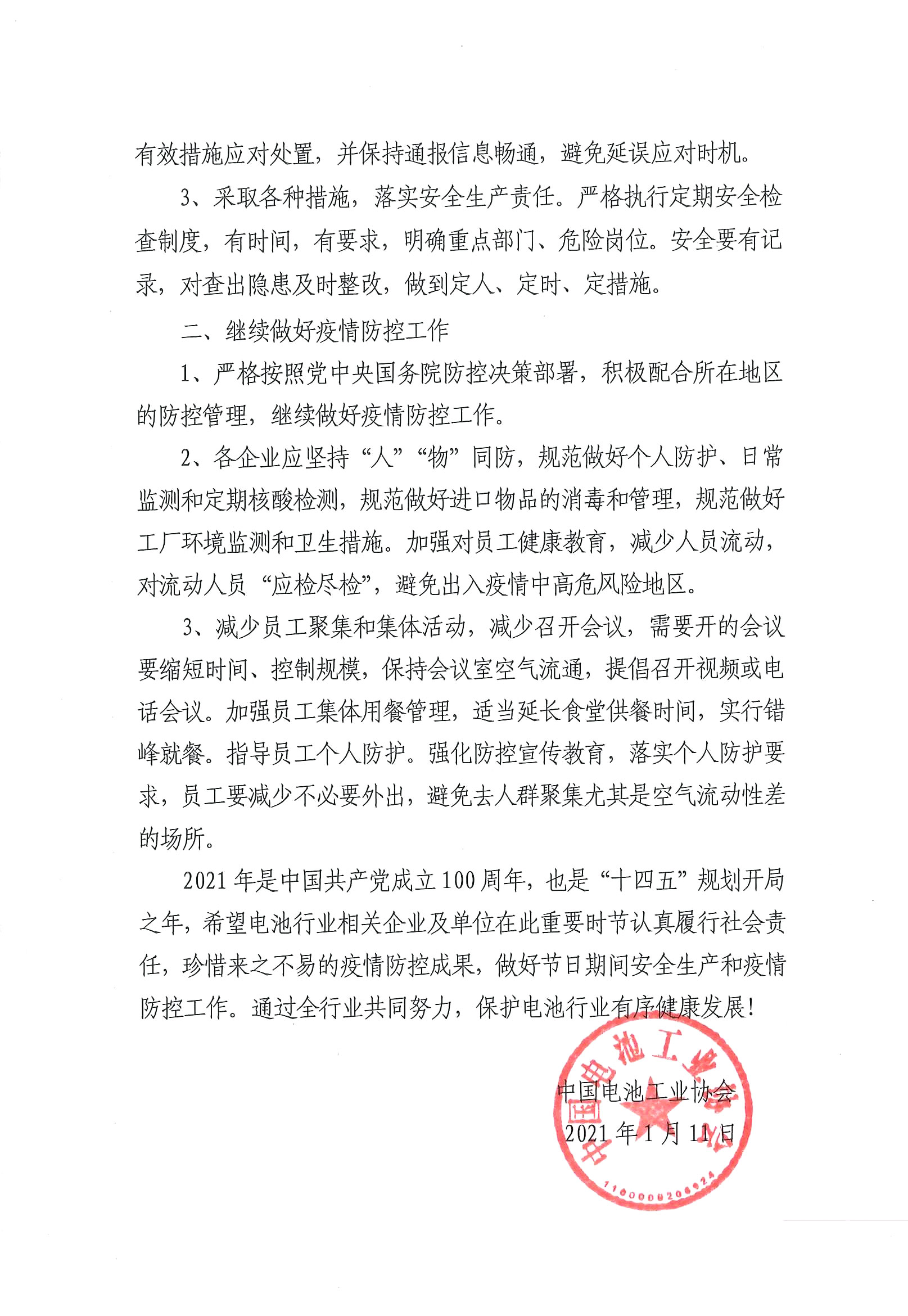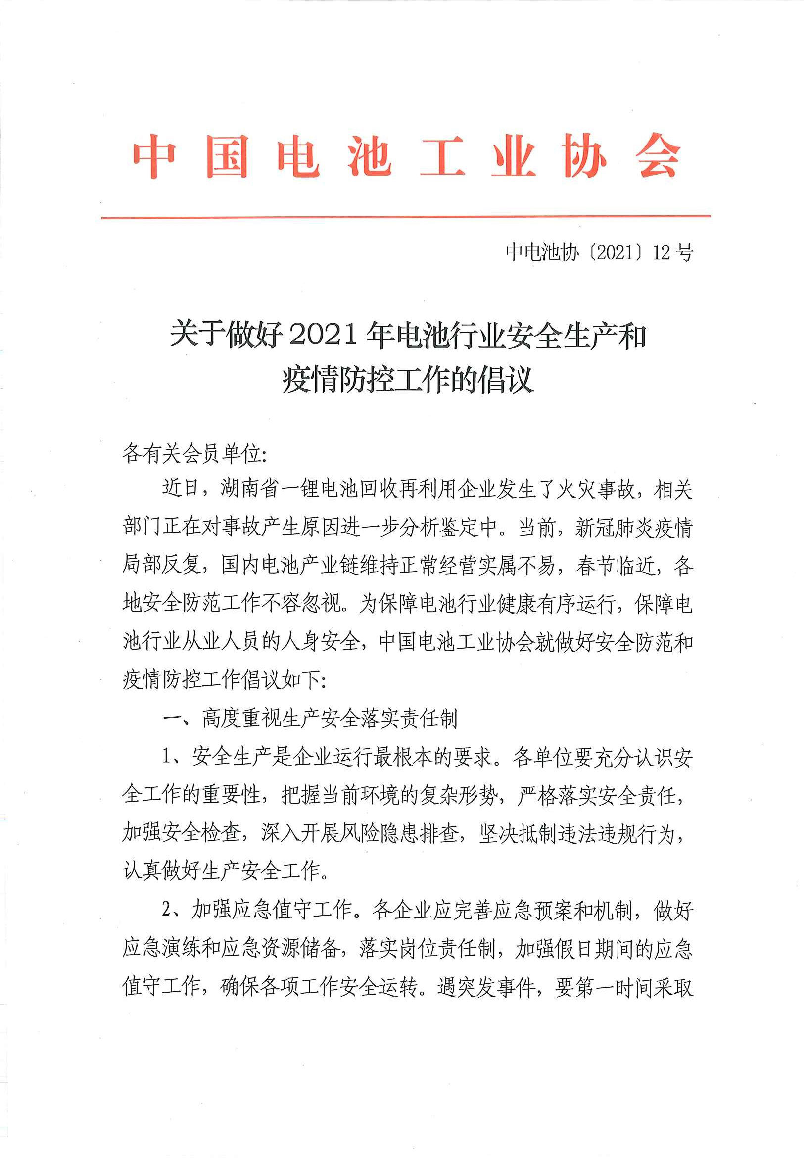 關于做好2021年電池行業安全生產和疫情防控工作的倡議