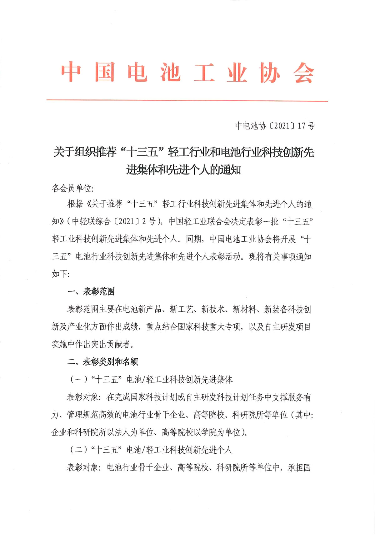關于組織推薦“十三五”輕工行業和電池行業科技創新先進集體和先進個人的通知-中國電池工業協會.zip