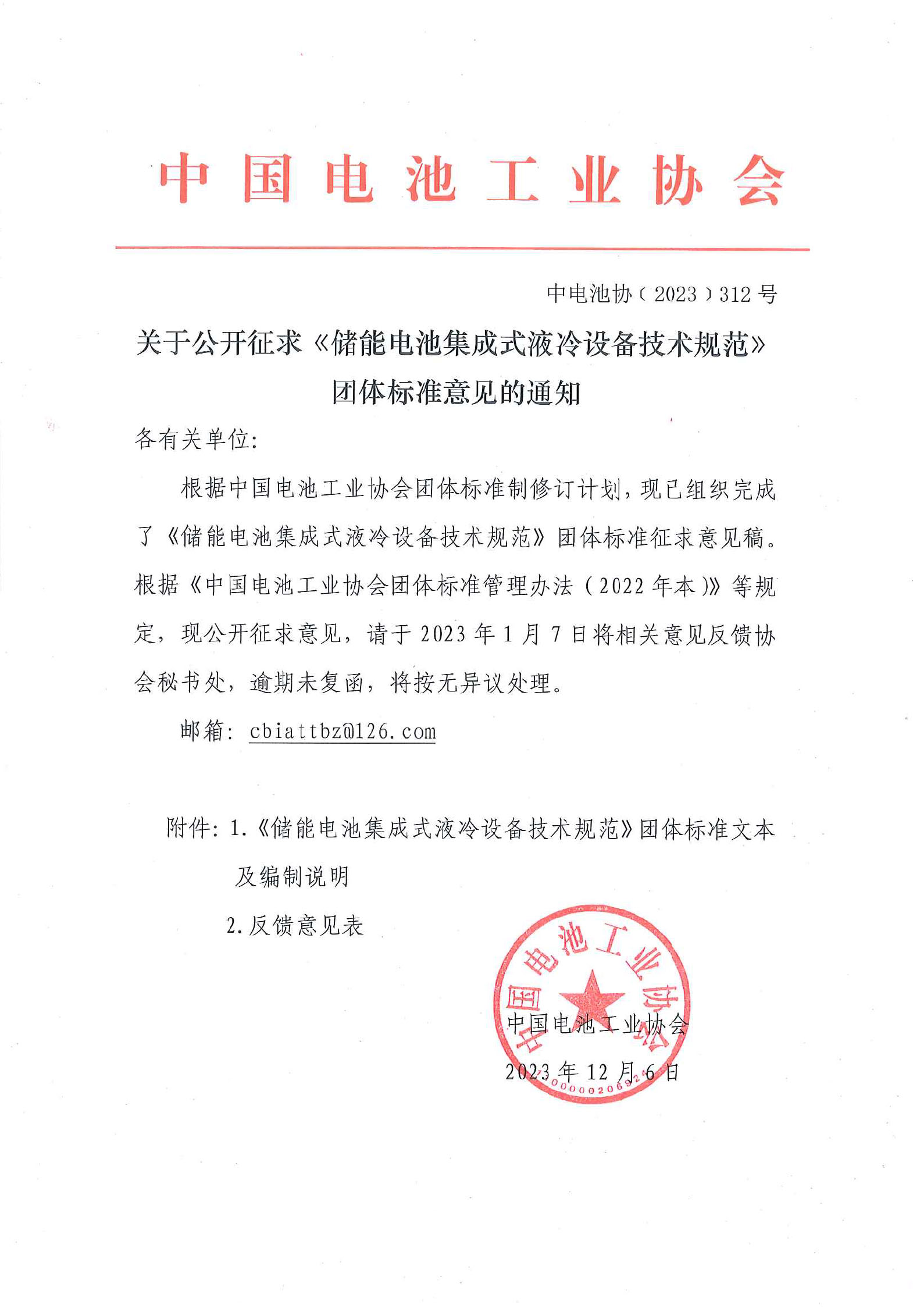 關(guān)于公開征求《儲能電池集成式液冷設(shè)備技術(shù)規(guī)范》團(tuán)體標(biāo)準(zhǔn)意見的通知