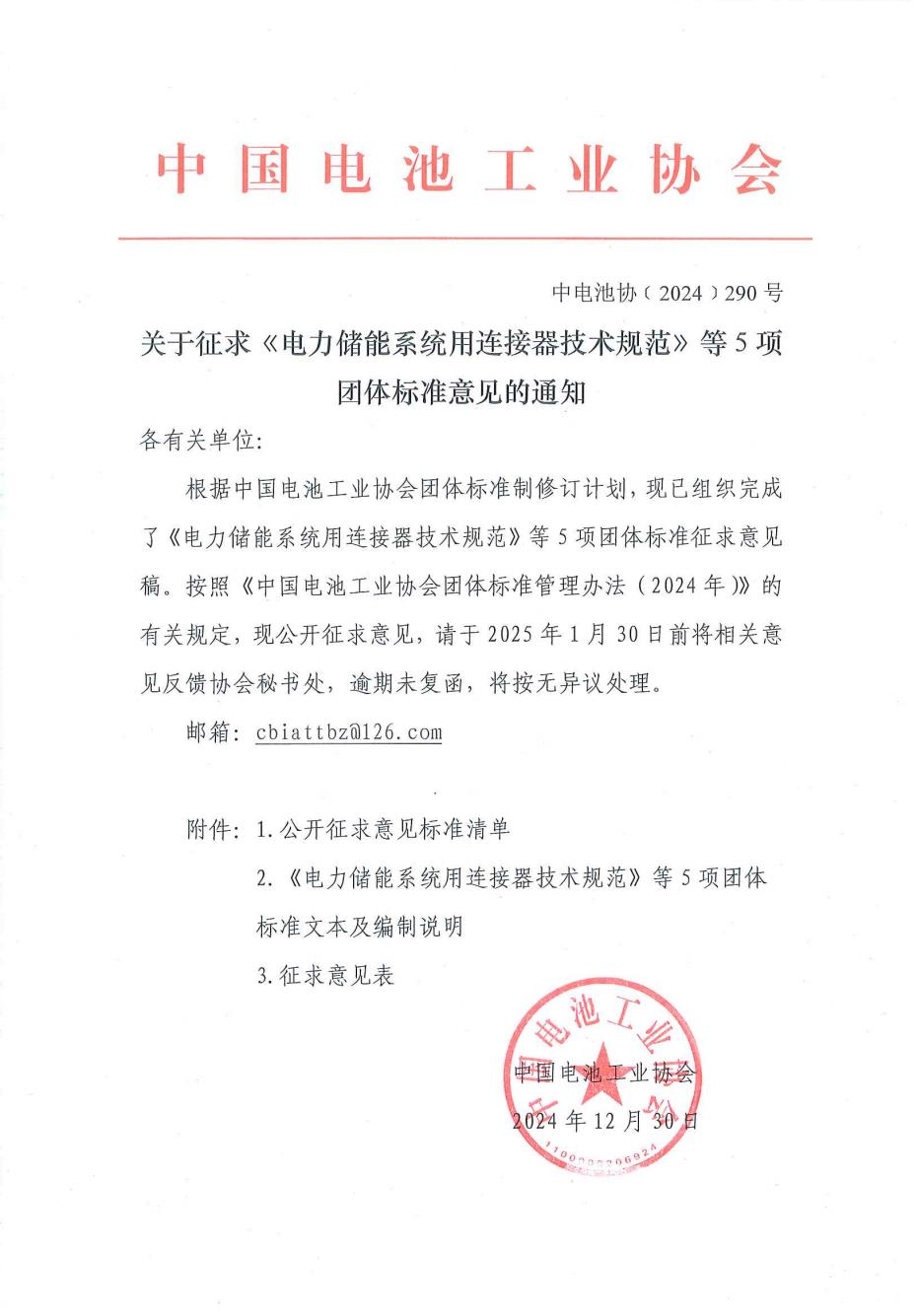 關于征求《電力儲能系統用連接器技術規范》等5項團體標準意見的通知