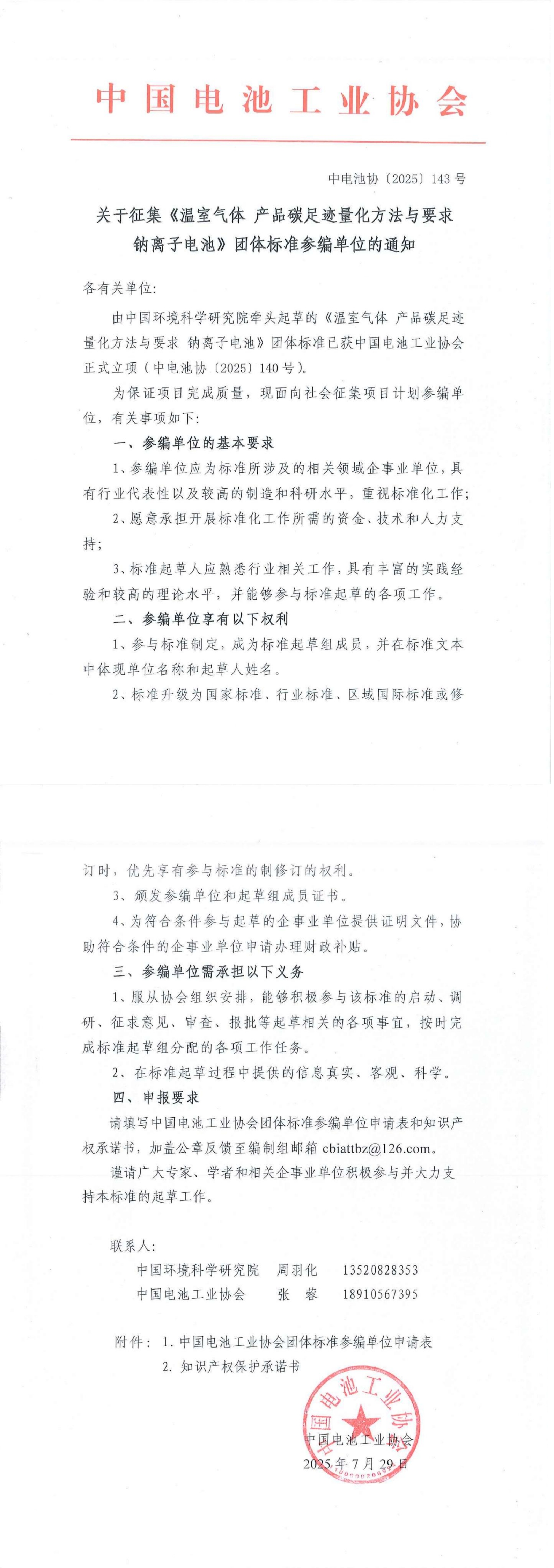 關于征集《溫室氣體 產品碳足跡量化方法與要求 鈉離子電池》團體標準參編單位的通知