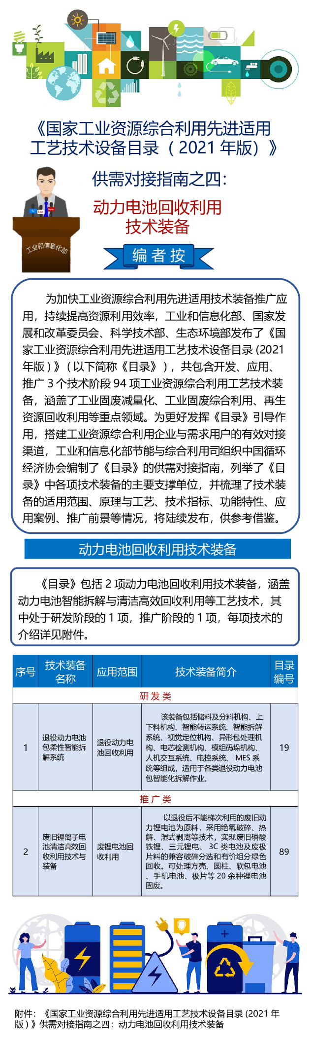 《國家工業資源綜合利用先進適用工藝技術設備目錄(2021年版)》供需對接指南之四:動力電池回收利用技術裝備