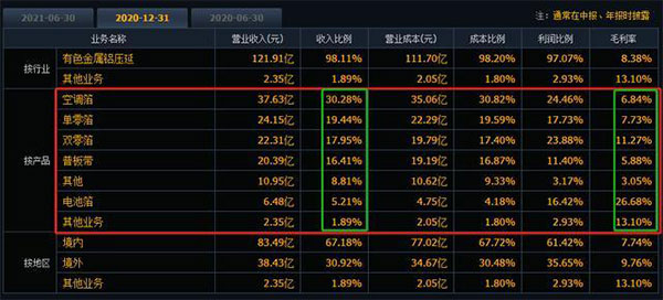 從業(yè)務收入結構看,空調箔卻仍是鼎勝新材第一大收入來源。2020年公司主要收入仍來源于空調箔,占比30.28%,由于空調箔屬于低附加值產(chǎn)品,市場競爭激烈,毛利率僅為6.84%。其次,單零箔、雙零箔及普板帶的收入規(guī)模均超過20億元,貢獻營收占比在16%以上,毛利率水平也較為一般。