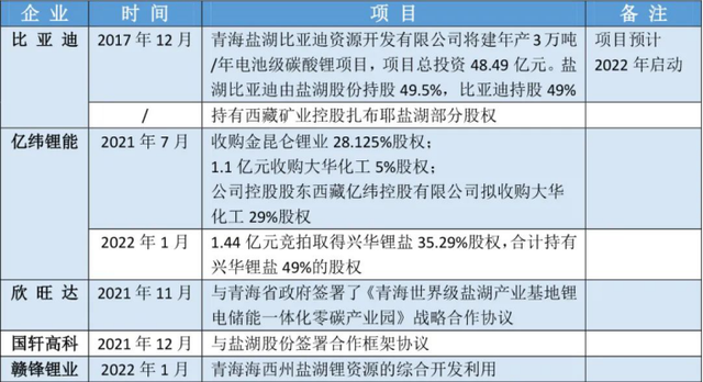 事實上,在贛鋒鋰業之前,包括比亞迪、億緯鋰能、國軒高科、欣旺達以及寧德時代等國內龍頭電池企業,皆已經在青海布局鹽湖資源。