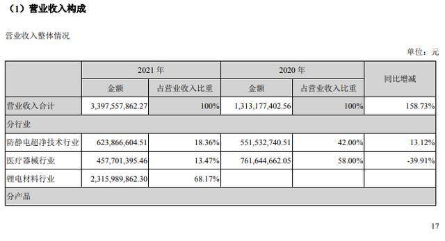 2月7日晚,天華超凈(300390,SZ)發(fā)布了2021年年報(bào),這也是天華超凈獲得鋰電業(yè)務(wù)后的首份年報(bào)。2021年,天華超凈實(shí)現(xiàn)營業(yè)收入33.98億元,同比上漲158.73%,實(shí)現(xiàn)歸母凈利潤9.11億元,同比上漲218.44%。
