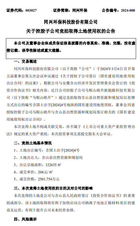 根據公告顯示,近日公司控股子公司馬鞍山皓升新能源科技有限公司通過競拍取得含山縣自然資源和規劃局以掛牌方式出讓的編號含國土出字[2024]4號地塊的國有建設用地使用權,該土地的取得將有利于加快啟動同興環保鈉離子電池正極材料項目的建設及運營。