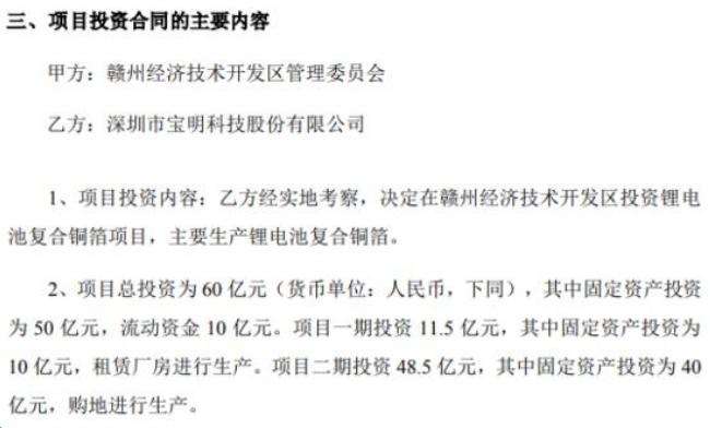 項目投資內容:乙方經實地考察,決定在贛州經濟技術開發區投資鋰電池復合銅箔項目,主要生產鋰電池復合銅箔。