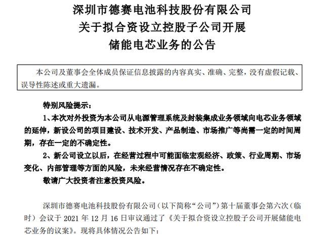 中華網財經12月16日訊,德賽電池公告,公司擬與戰略投資者等相關方合資設立控股子公司,開展儲能電芯業務,注冊資本為5億元,其中公司以現金出資3.5億元。