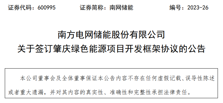 南網(wǎng)儲(chǔ)能(600995)于4月22日發(fā)布公告稱,南方電網(wǎng)儲(chǔ)能股份有限公司(乙方)于2023年4月21日與廣東省肇慶市發(fā)展和改革局(甲方)共同簽訂《肇慶綠色能源項(xiàng)目合作開發(fā)框架協(xié)議》。