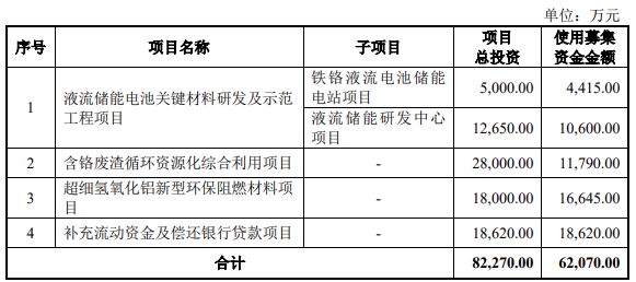 湖北振華股份本次向不特定對象發行可轉換公司債券,擬募集資金總額不超過62070.00萬元投資相關項目,其中液流儲能電池關鍵材料研發及示范工程項目分為兩個子項目,鐵鉻液流電池儲能電站項目和液流儲能研發中心項目,兩個子項目分別投資5000萬元和1.265億元。