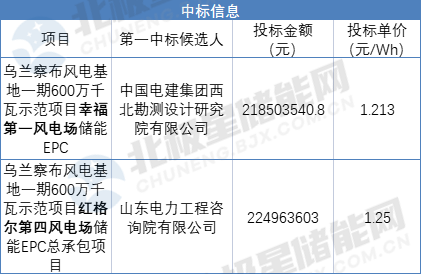 7月12日,國家電投內蒙古烏蘭察布風電儲能EPC招標公布中標候選人。中國電建集團西北勘測設計研究院有限公司和山東電力工程咨詢院有限公司分別為兩個項目的第一中標候選人。