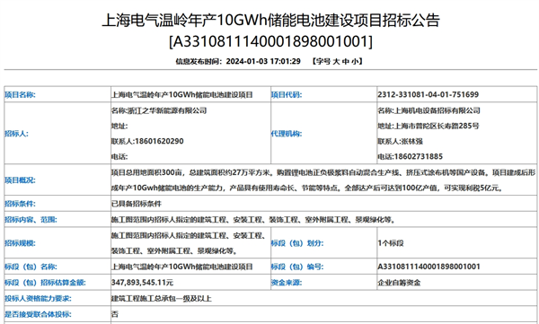 1月3日,上海電氣溫嶺年產10GWh儲能電池建設項目招標公告發布。公告顯示,項目總用地面積300畝,總建筑面積約27萬平方米。購置鋰電池正負極漿料自動混合生產線、擠壓式涂布機等國產設備。項目建成后形成年產10GWh儲能電池的生產能力,產品具有使用壽命長、節能等特點。全部達產后可達到100億產值,可實現利稅5億元。