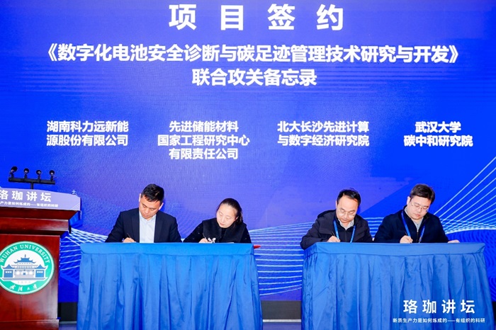 聯(lián)合體成員科力遠(yuǎn)、先進(jìn)儲(chǔ)能材料國(guó)家工程研究中心、武漢大學(xué)碳中和研究院、以及北京大學(xué)長(zhǎng)沙計(jì)算與數(shù)字經(jīng)濟(jì)研究院簽署了《數(shù)字化電池安全診斷與碳足跡管理技術(shù)研究與開(kāi)發(fā)》聯(lián)合攻關(guān)備忘錄簽約。合作各方將在數(shù)字化電池安全診斷與預(yù)警、儲(chǔ)能電站全生命周期管理等方面開(kāi)展聯(lián)合攻關(guān)合作。武漢大學(xué)碳中和研究院與深圳市人才集團(tuán)有限公司簽署了《武漢大學(xué)碳中和研究院聯(lián)合設(shè)立(深圳)研究中心的合作協(xié)議》,雙方將在人才引進(jìn)、培養(yǎng)機(jī)制及科研成果轉(zhuǎn)化方面進(jìn)行創(chuàng)新探索。