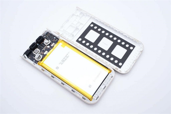 充電頭網通過拆解發現,該 10000mAh 移動電源電池組選用兩片軟包電芯組成電池組,點焊至 PCB 通過串聯方式進行供電,兩片電芯之間放置了 NTC